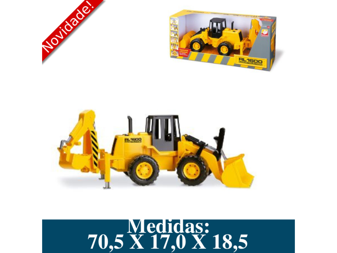 A retroescavadeira Rl-1600 é totalmente articulada. Ela possui articulações nos braços para levantar e abaixar, na caçamba para carregar e descarregar e no chassis, permitindo que ela vire pra direita e para a esquerda.