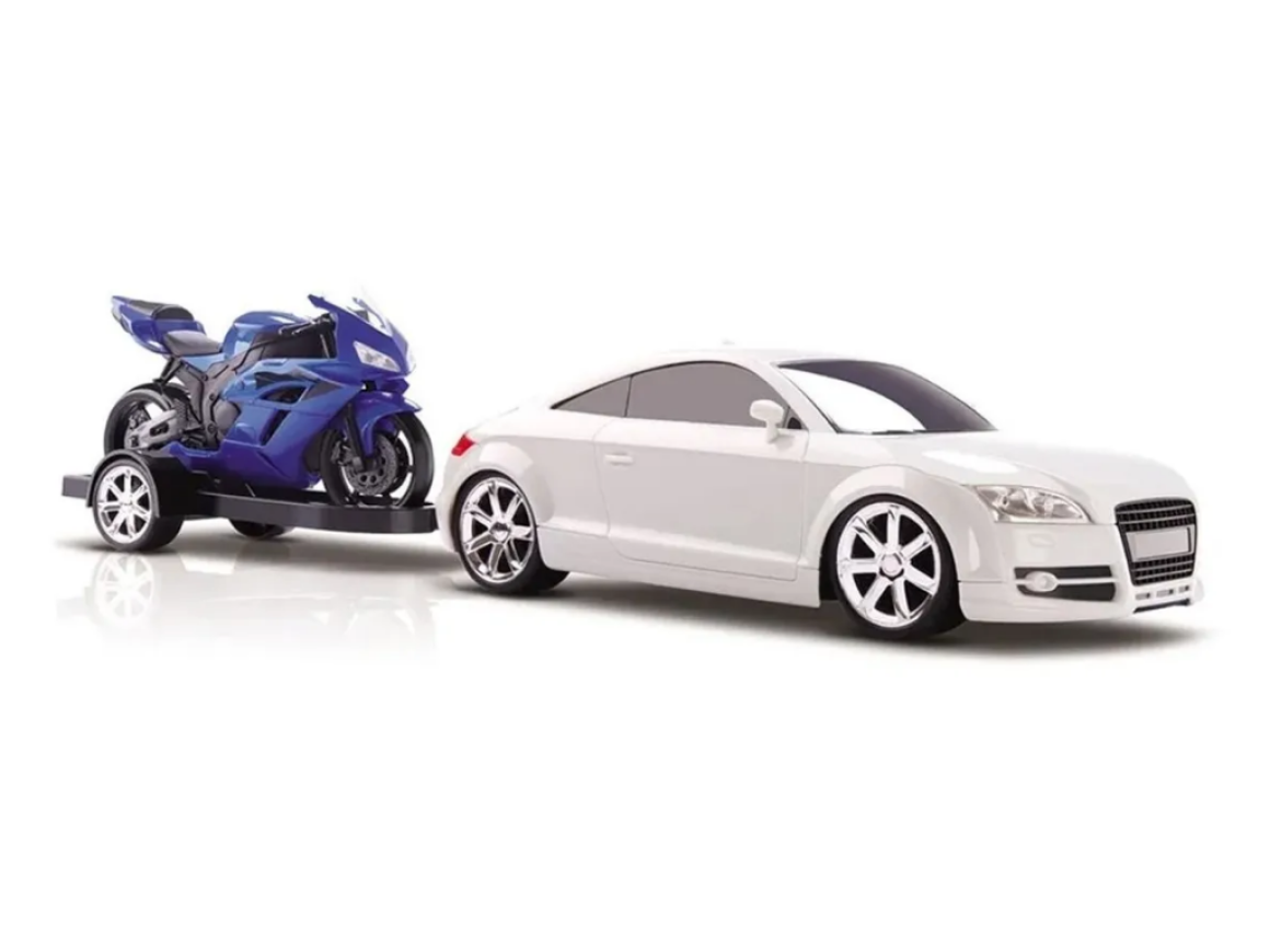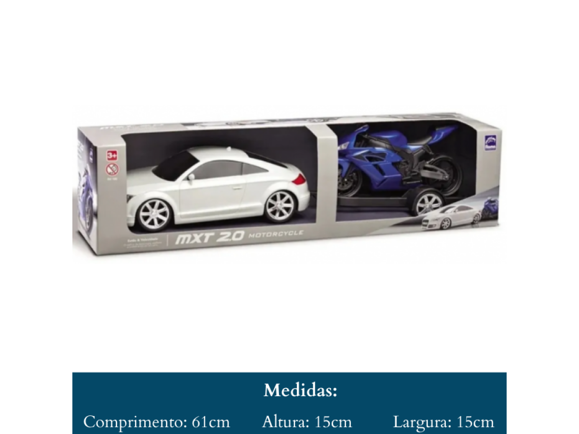 Dimensões aproximadas do produto (AxLxC): Carro – 9,5 x 15 x 30 cm / Moto – 13 x 8 x 24 cm / Carretinha: 5 x 14 x 26 cm