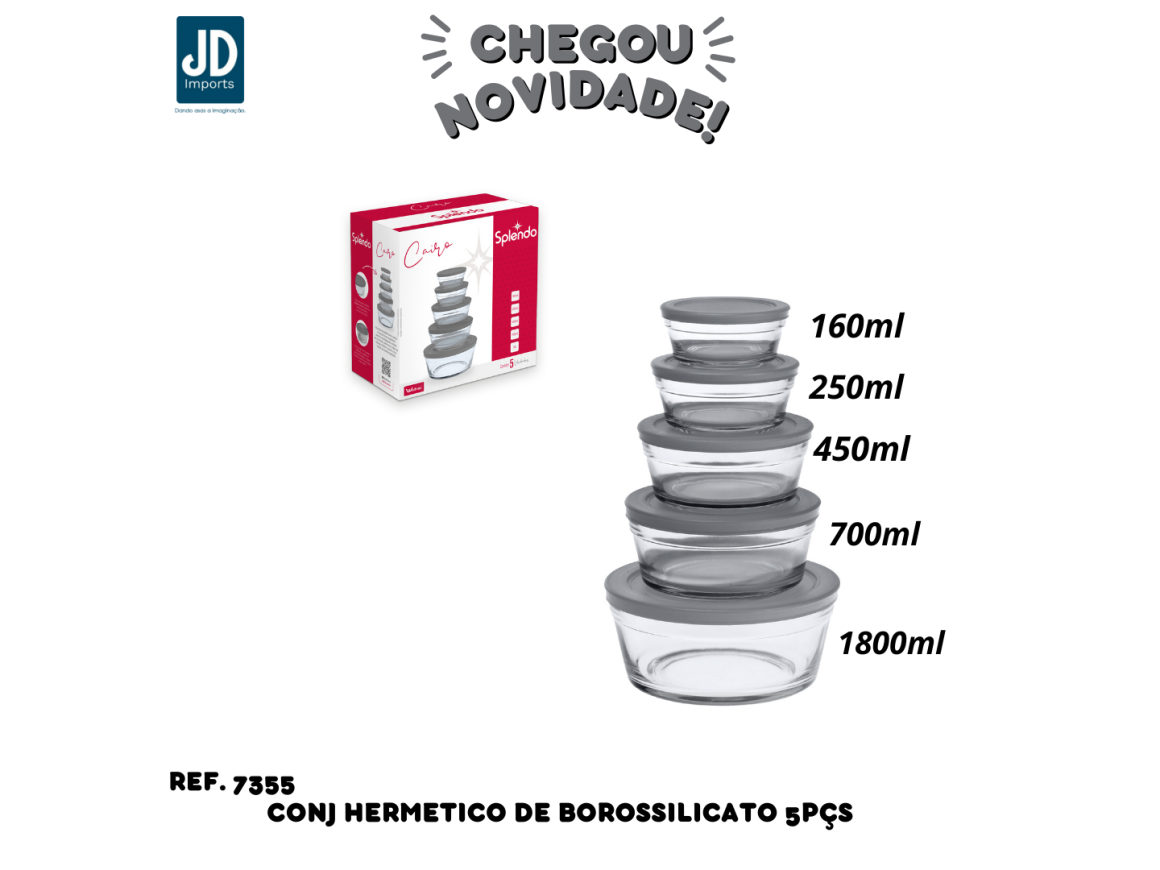 CONJ HERMETICO DE BOROSSILICATO 5 PÇS 160ML 250ML 450ML 700ML 1800ML CINZA CAIRO 7355