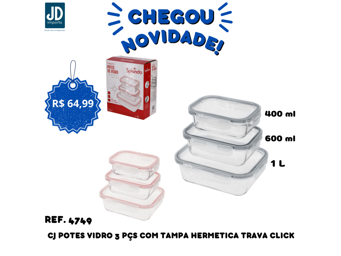 CONJ POTES VIDRO 3 PÇS COM TAMPA HERMETICA TRAVA CLICK RETANGULAR 400-600-1L 4749
