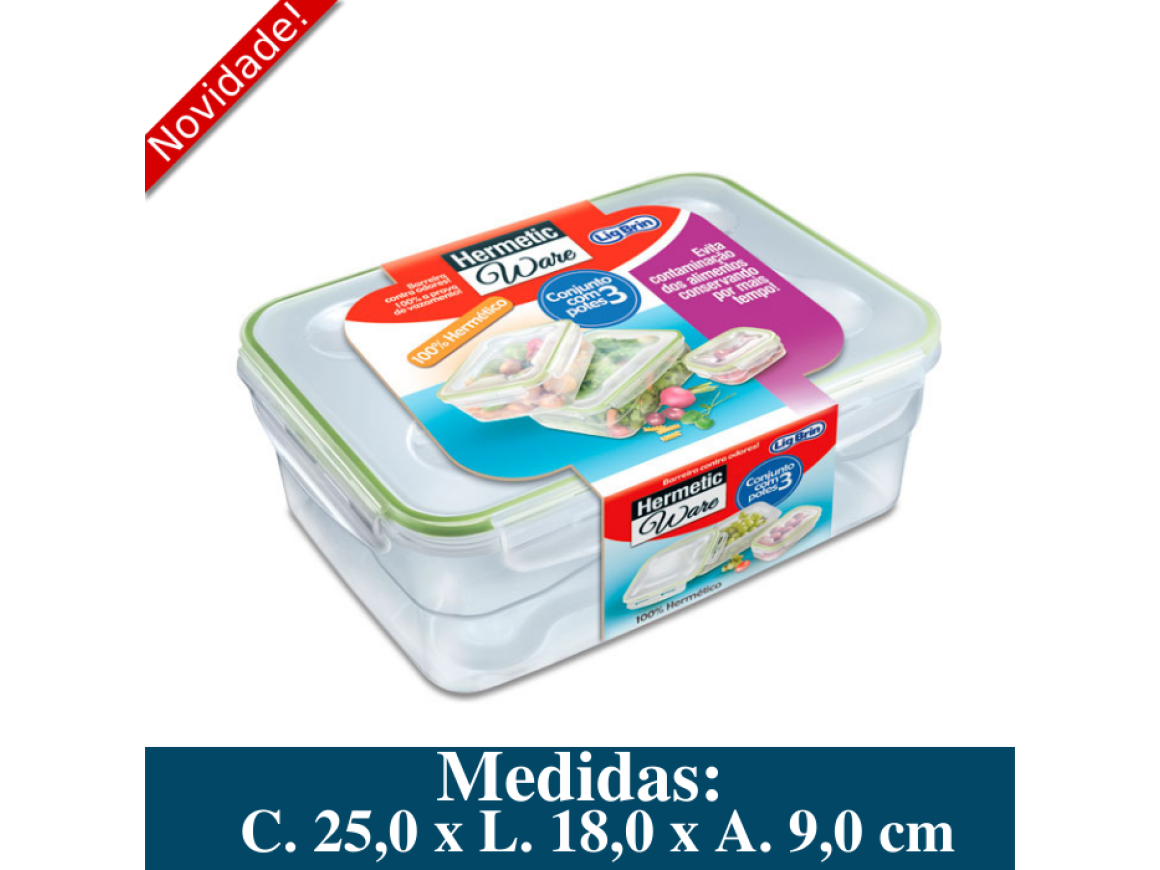 Detalhes: 100 % Hermético. 100% a prova de vazamentos. Evita contaminação do alimento conservando por mais tempo. Barreira contra odores.