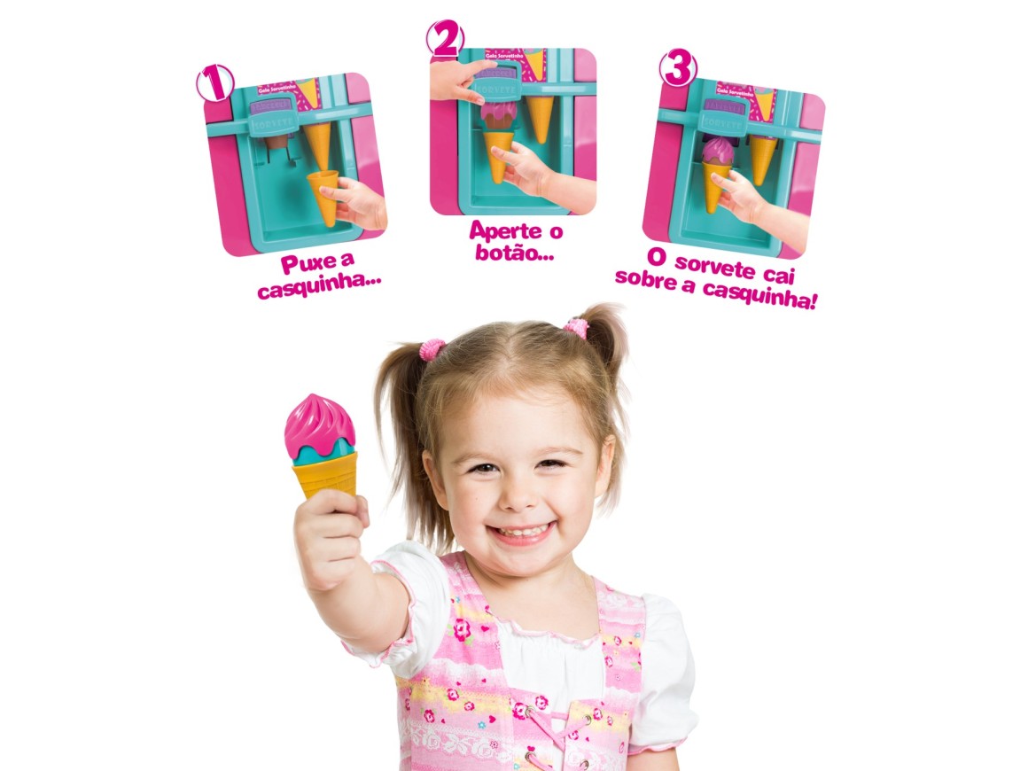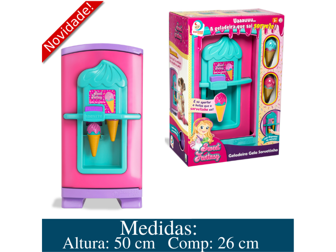 Descrição: A Geladeira Gela Sorvetinho é o sonho de toda criança, afinal, qual criança não sonha em ter uma geladeira que sai sorvete da porta?! Isso mesmo: Ela é uma geladeira com dispenser de sorvete! Ao puxar a casquinha e apertar o botão a criança retira o sorvetinho da porta! Ah! E também vem com forminha para fazer sorvetinho de verdade que pode ser inserido no dispenser para a brincadeira ficar ainda mais real. Conteúdo: A Geladeira Gela Sorvetinho vem com 2 sorvetinhos, 2 casquinhas, 1 forminha para fazer sorvete, 2 prateleiras internas, além do dispenser que sai sorvetinho. Idade: +3 anos Dimensões (cm): 50 cm de altura e 26 cm de comprimento.
