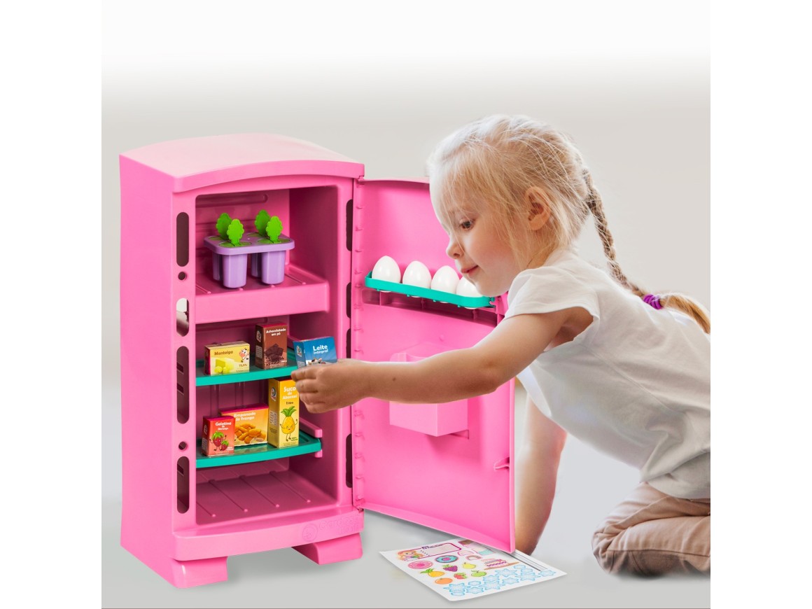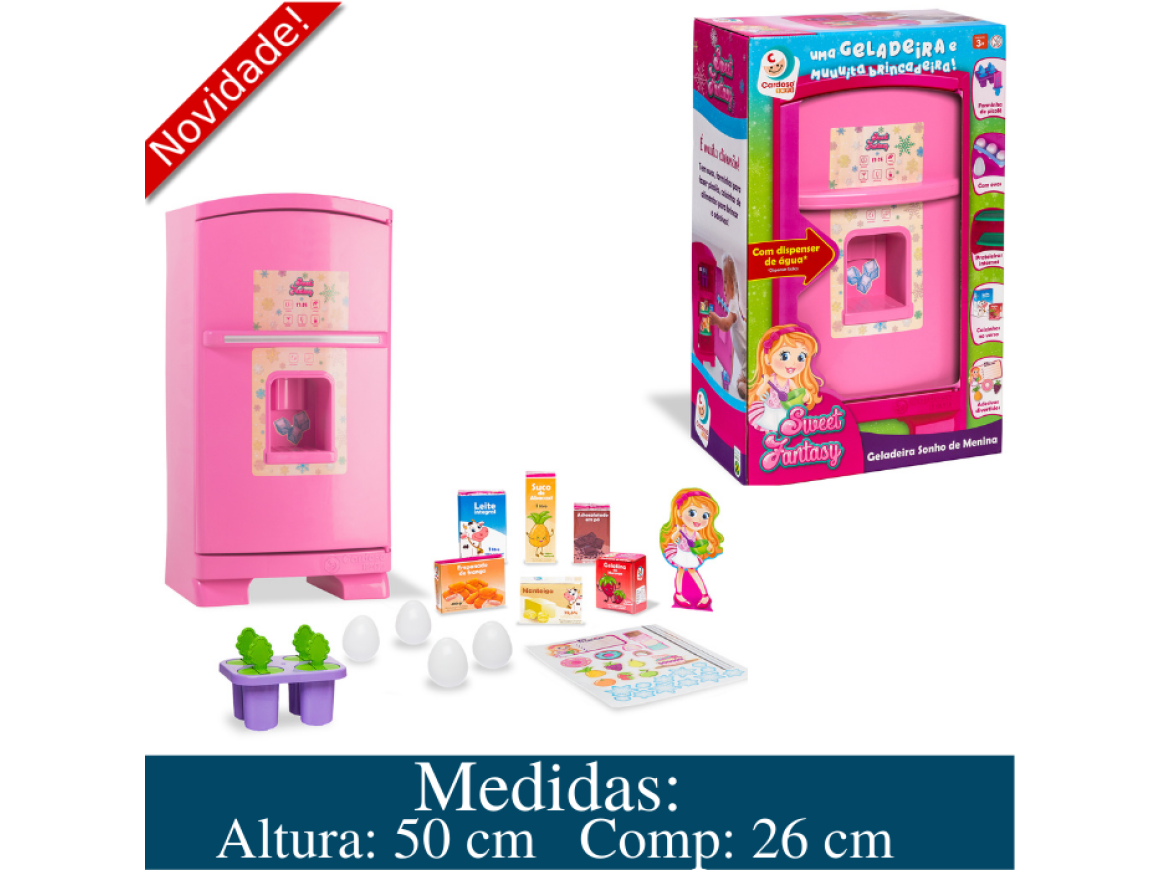 Essa linda geladeira tem um tamanho grande e encorpado. Com 50 cm de altura, e diversos acessórios para brincar, ela tem um dispenser lúdico na porta, prateleiras internas, porta-ovos com 4 ovos, fôrma para fazer picolé, cartela de adesivos e caixinhas para recortar e montar que tornam a brincadeira ainda mais lúdica e divertida! Conteúdo: A Geladeira Sonho de Menina vem com 2 prateleiras internas, suporte para ovos, 4 ovos, 1 forminha para fazer picolé, 1 cartela de adesivos e caixinhas para recortar no verso da embalagem. Idade: 3 a 5 anos Dimensões (cm): 50 cm de altura e 26 cm de comprimento.